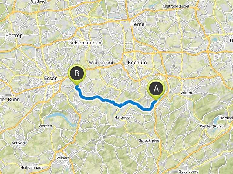 Die amtliche fahrradkarte ist ein kooperationsprojekt zwischen dem amt für geoinformation vermessung und kataster der stadt essen und dem amt für geodatenmanagement vermessung kataster und wohnbauförderung der stadt mülheim an der ruhr. Der grugaweg in essen verläuft vom knotenpunkt 1 auf der rheinischen bahn über essen rüttenscheid zum knotenpunt 51 an der ruhr. Die grugatrasse startet in essen steele und führt von dort aus auf asphaltiertem fußgänger radweg der größtenteils über eine alte bahntrasse führt in richtung essener zentrum. Der radweg auf der alten erzbahn verbindet bochum mit gelsenkirchen und durchquert dabei den grünzug d von süd nach nord.